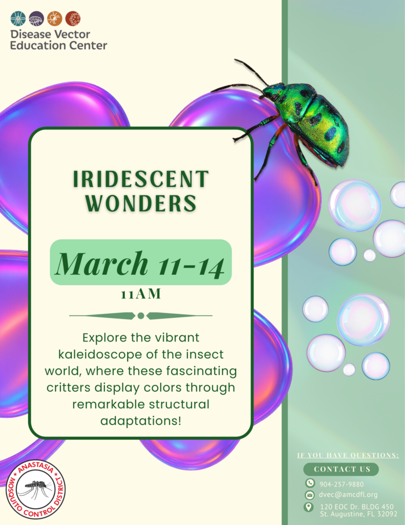 Join us at the Disease Vector Education Center for this week’s Crazy Science as we explore the dazzling colors of the insect world. Many insects shine with brilliant colors not from pigments, but from structural coloration that bends and reflects light.