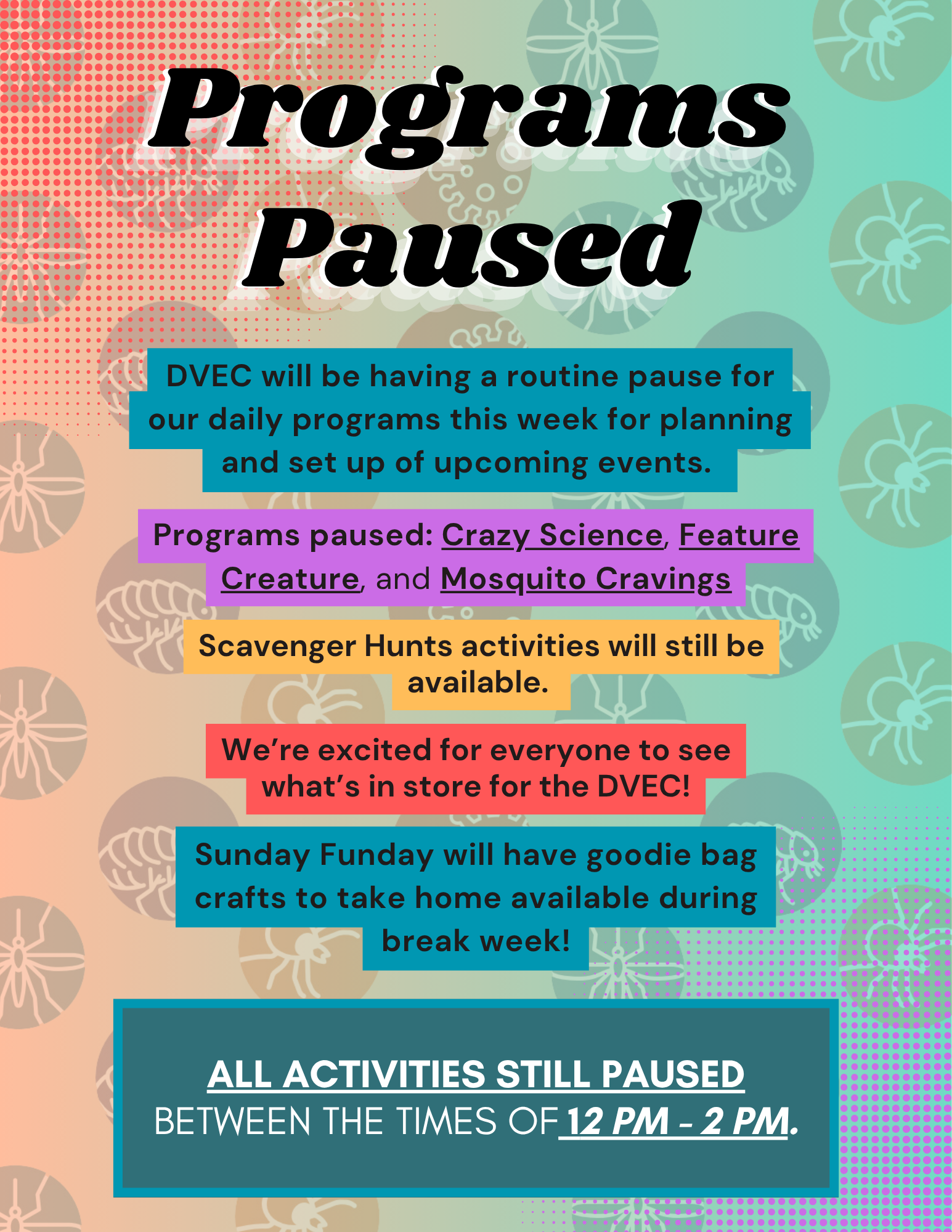 Hi everyone! Just a quick reminder—the DVEC will be taking a short routine pause on programs from June 25th to June 29th to prepare for all the exciting activities we’ve got coming in July! This means Crazy Science, Feature Creature, and Mosquito Cravings will be paused during this week. But don’t worry—Scavenger Hunts will still […]