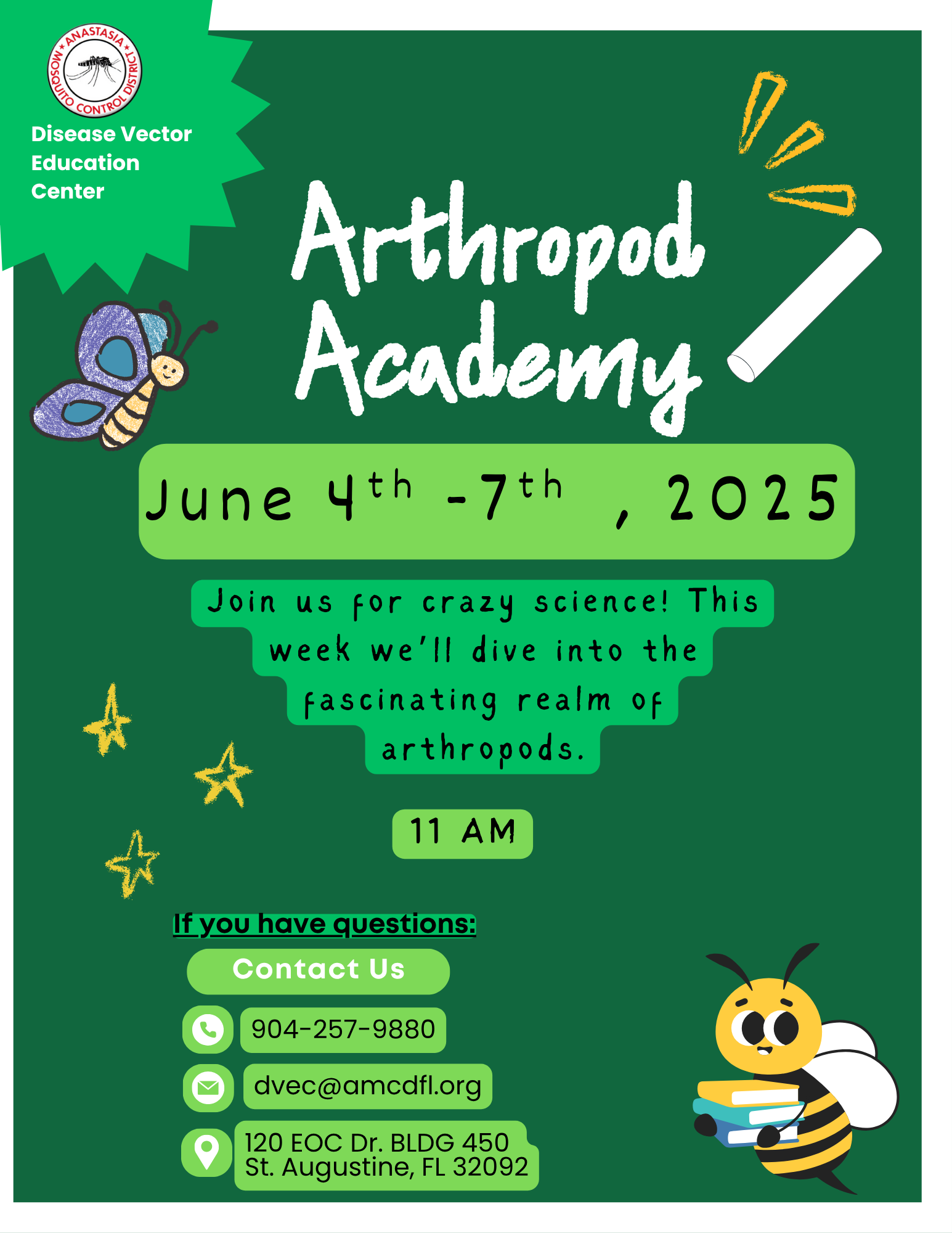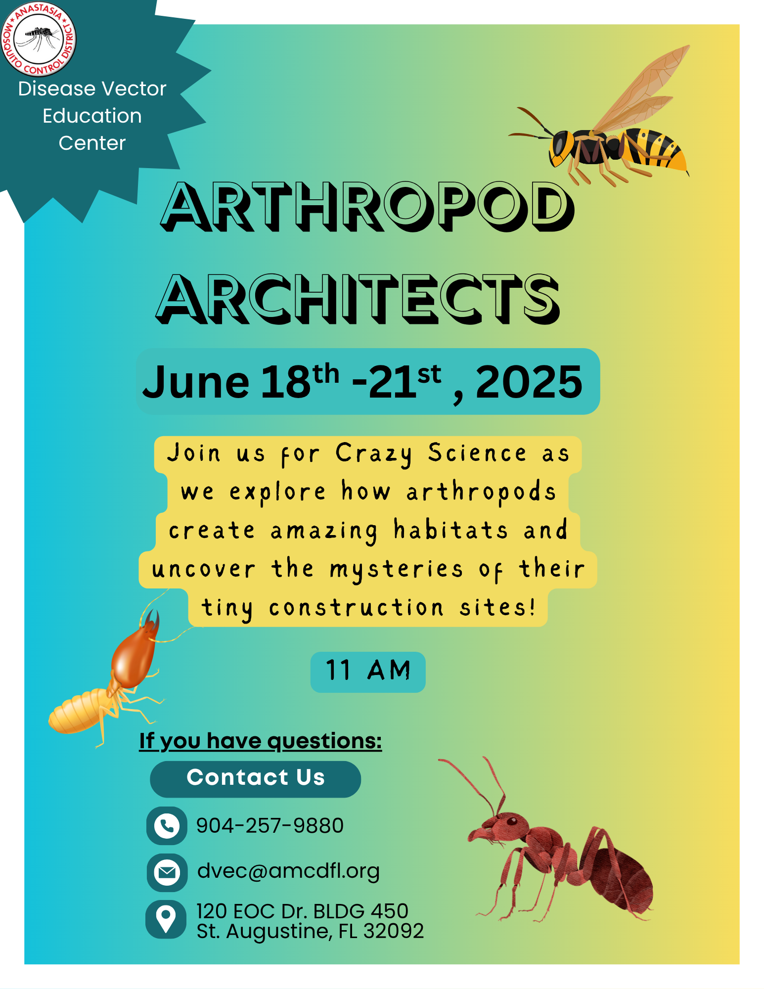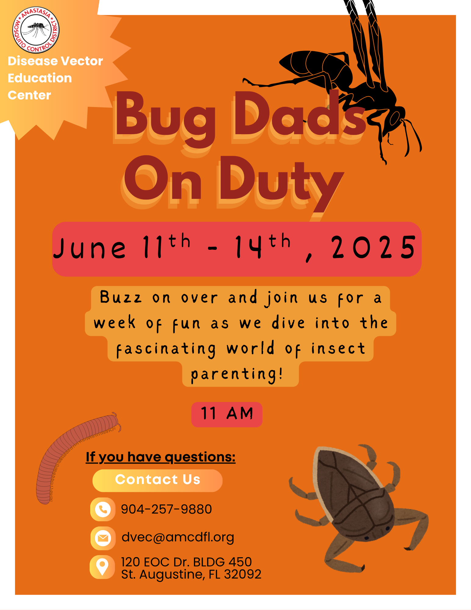 Class is in session—it’s time for Crazy Science! 📅 June 11th–14th, 2025 ⏰ 11 AM 📍 Disease Vector Education Center – St. Augustine, FL This week, we're celebrating the superdads of the insect world! 🐜🕷️ From water bugs that carry their eggs to beetle dads who guard their young, insect parenting comes in […]