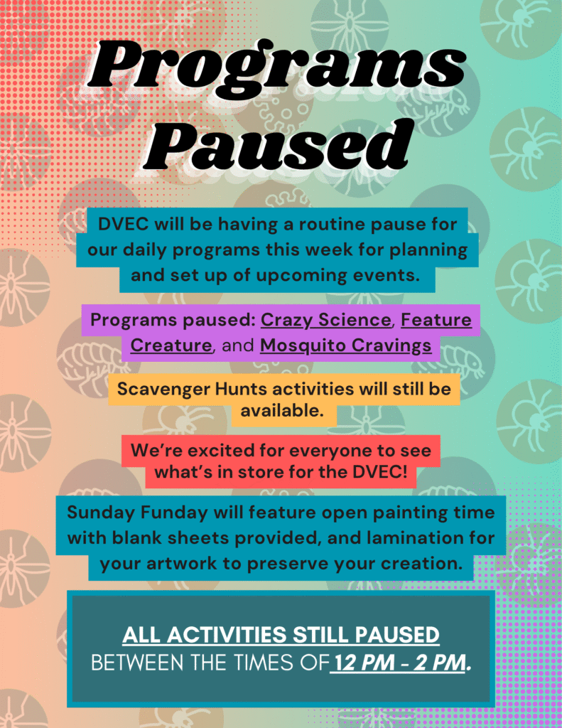 Welcome to the DVEC! Join us for daily programs Wed-Sat. A quick reminder, all activities and programs pause daily between 12 PM- 2 PM. Daily programs (Except for Fish Frenzy) […]